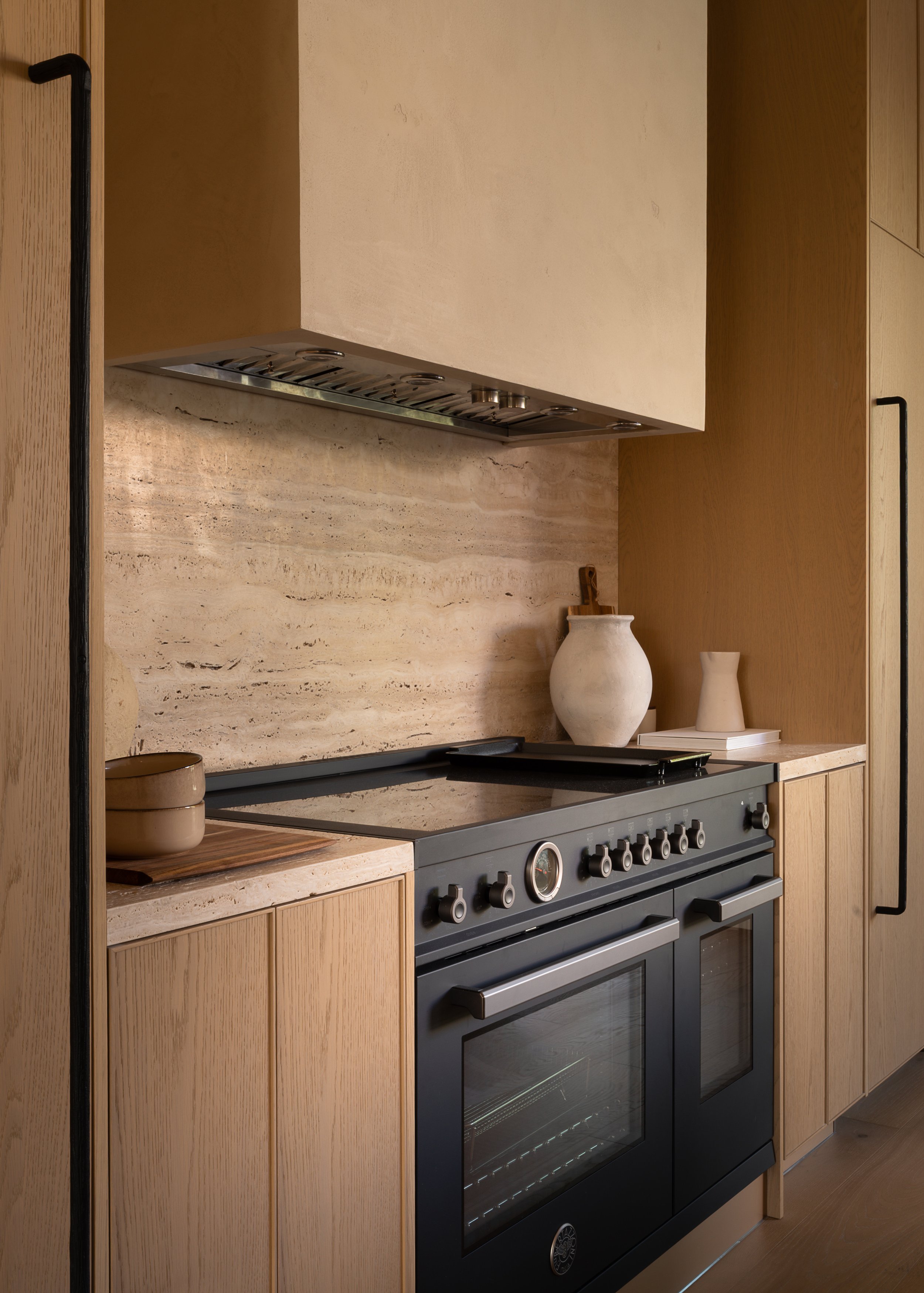 Chef’s kitchen with limestone island and Bertazzoni range