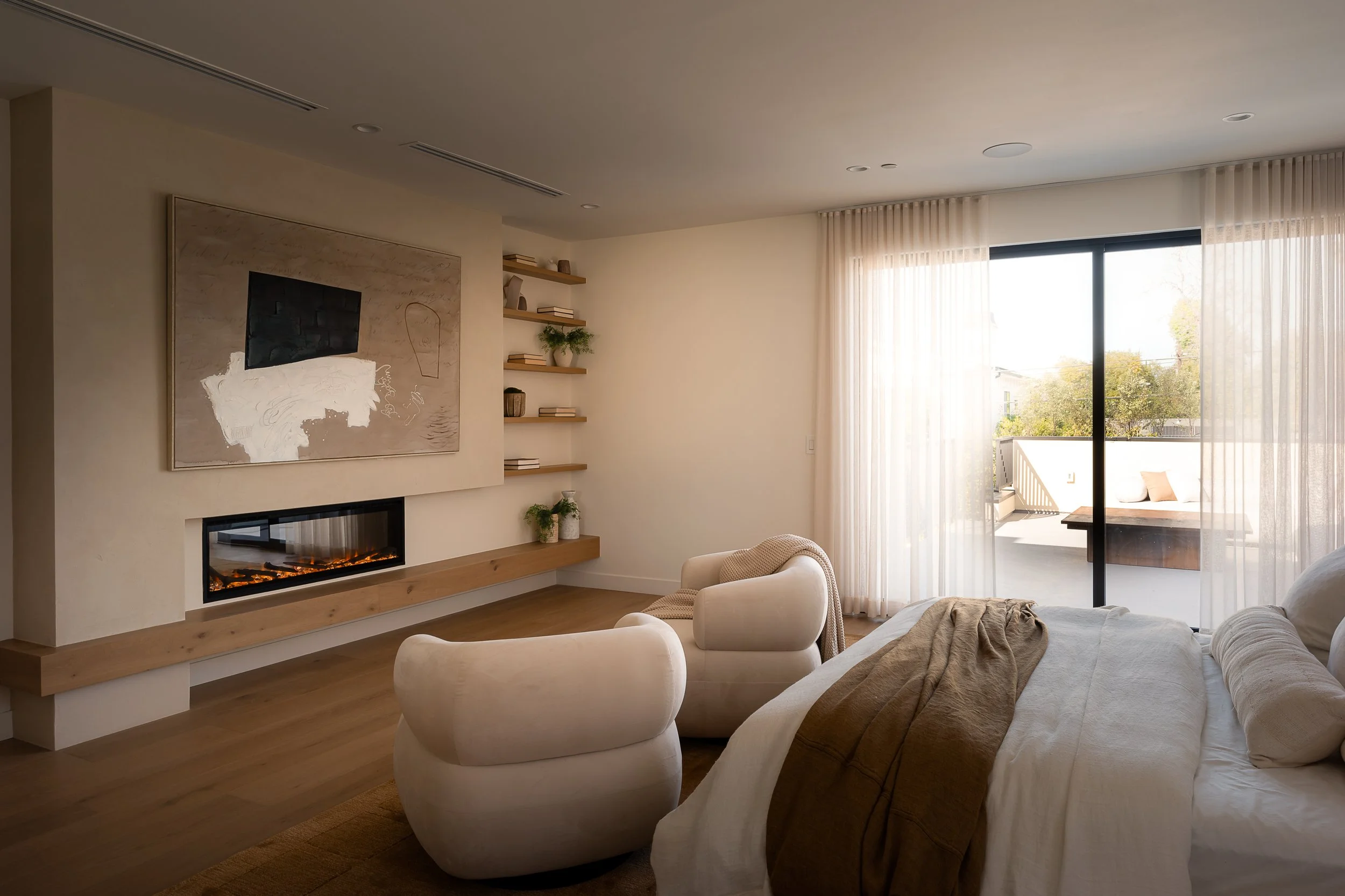 Primary suite with balcony, fireplace, and dual walk-in closets